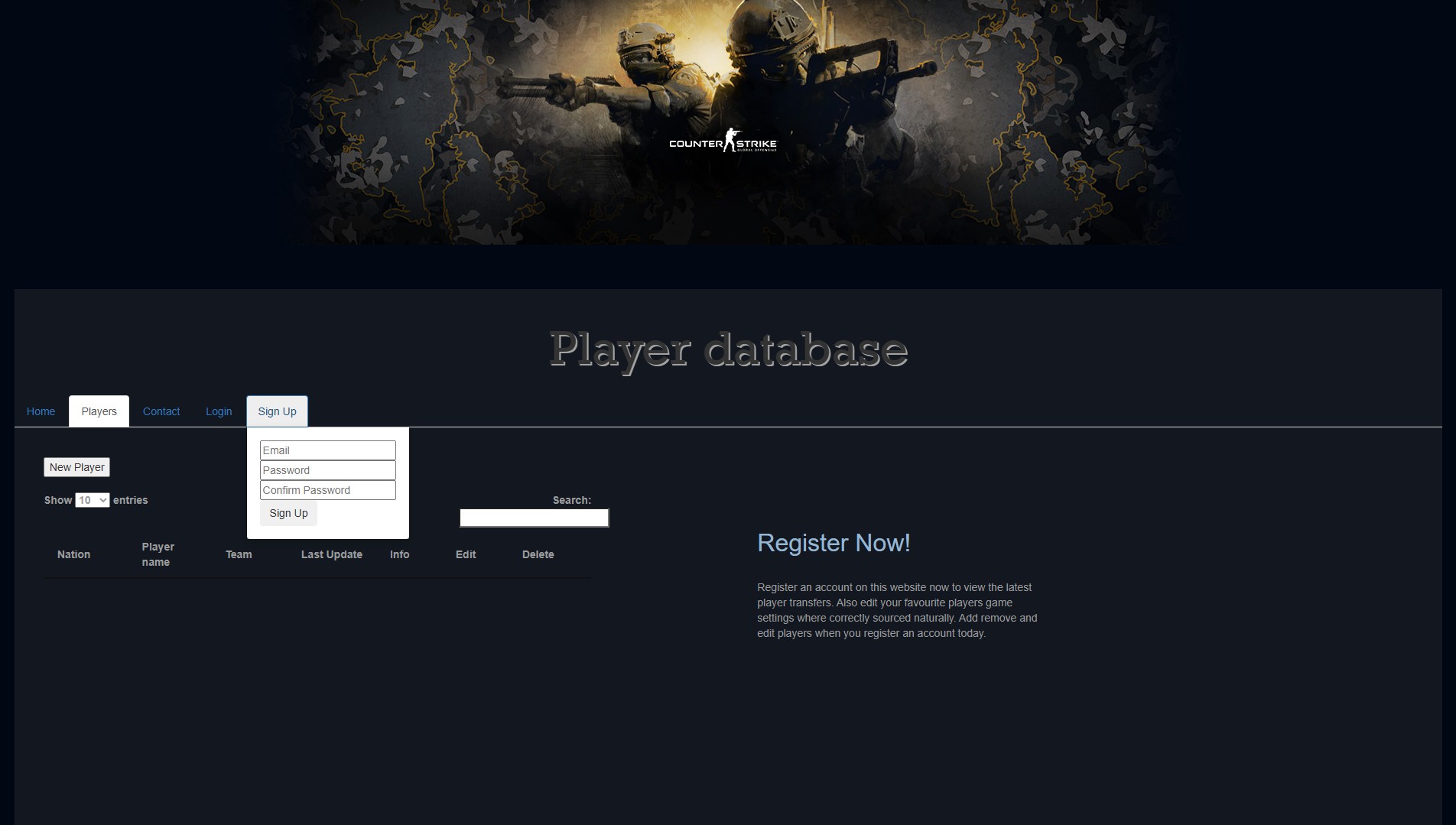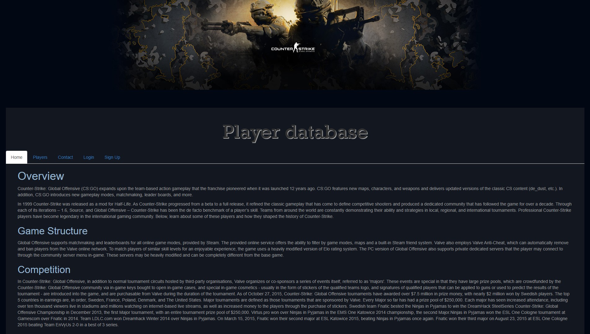 This was a Counter Strike professional player indexer, a university project which was a precurser to what I later developed with CS Codex. This was a very basic implementation but gave me some insights into application development.