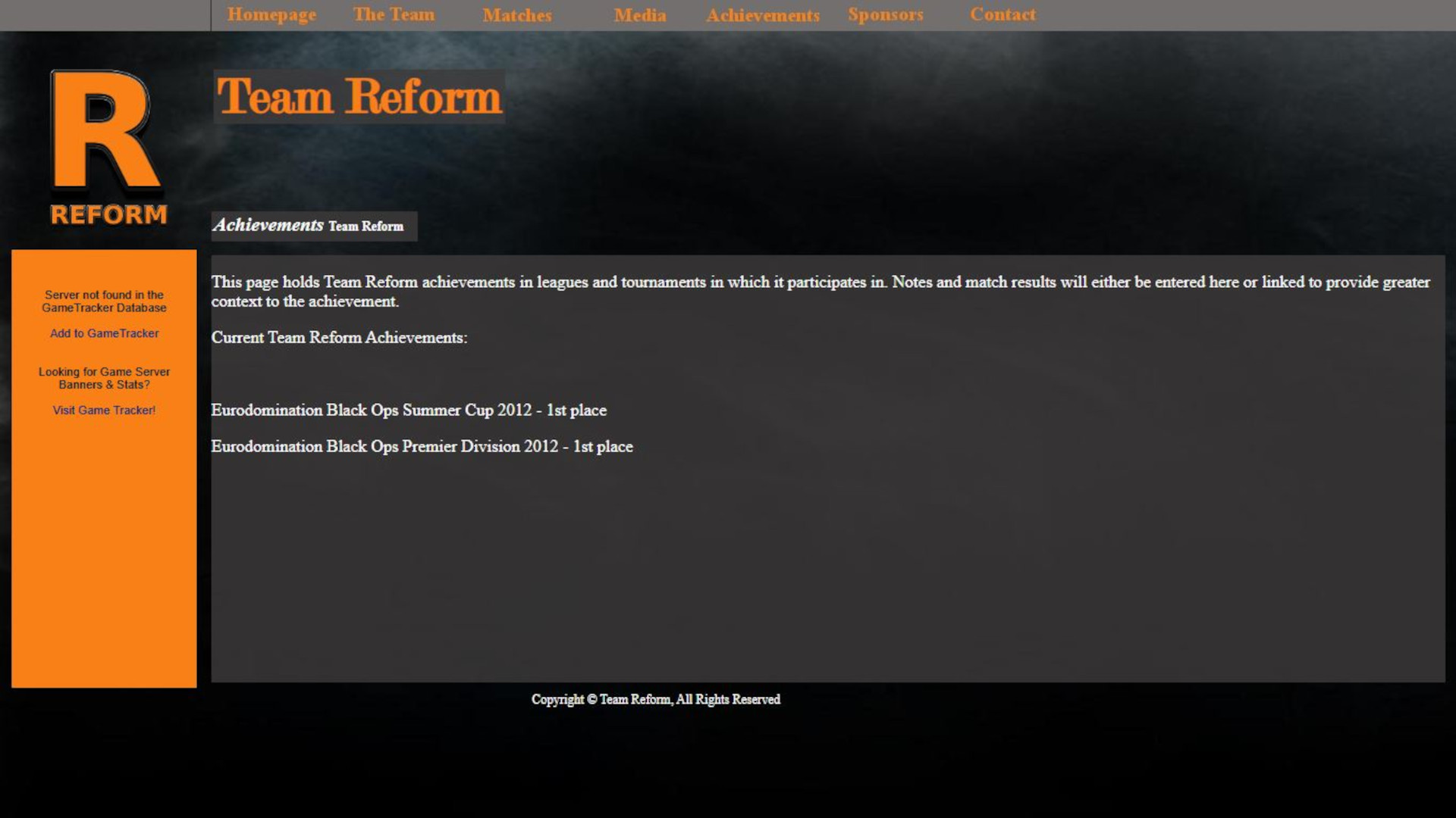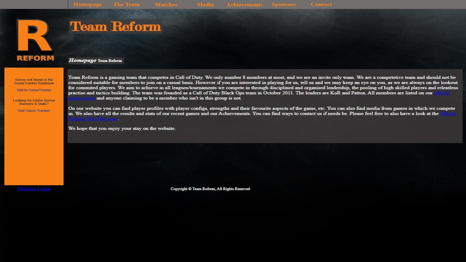 My first website was build for a computer game clan (community) called Reform playing the game Call of Duty: Black Ops. In this basic website, the team roster, results and other such details were listed. This was a very basic implementation using primitive HTML, CSS alone with easily bypassable private areas in the website. This was my first taste of web design, which although never became my main focus, I quickly moved beyond this level for future projects.